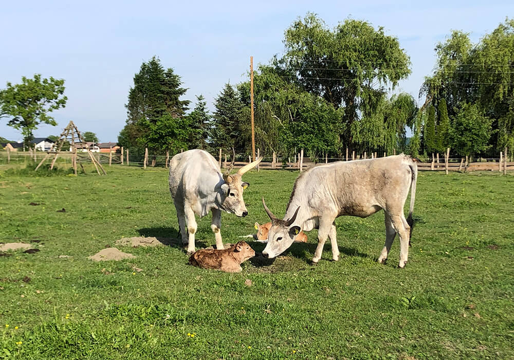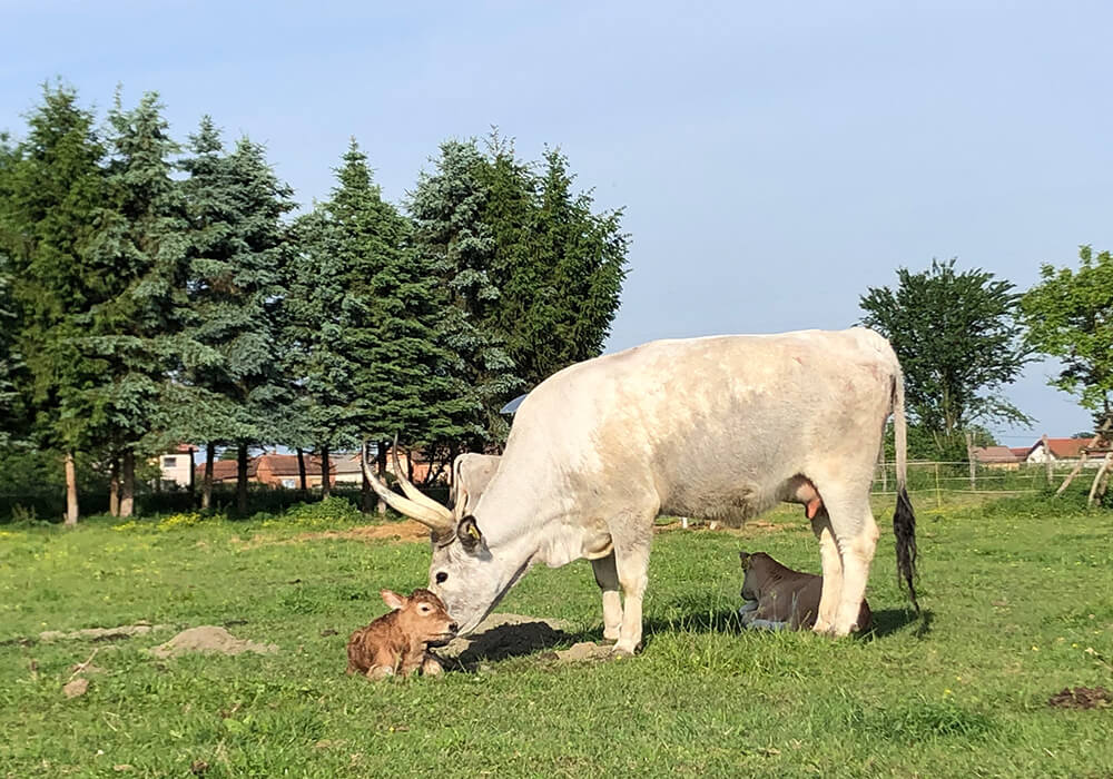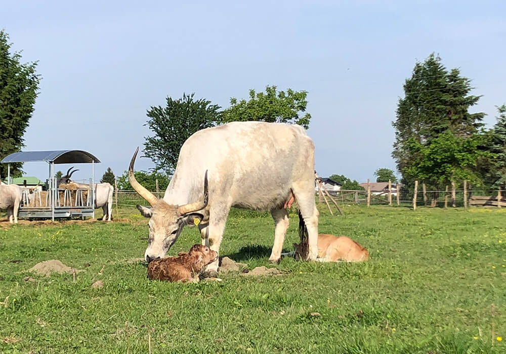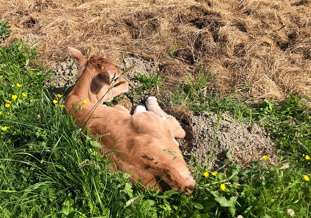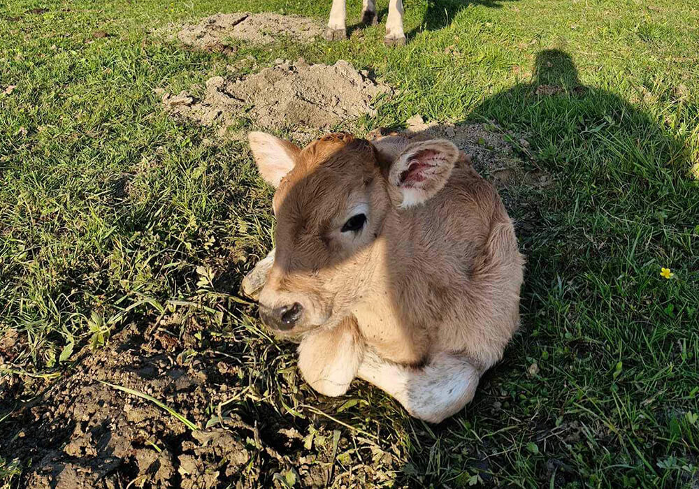 Am 11. Mai 2024 wurde am Betrieb ein weiteres Kalb zur Welt gebracht. Voller Energie und Neugier gerät das kleine Kalb schnell in den Mittelpunkt der Aufmerksamkeit seiner Mutter und des Rests der Herde. Sie verfolgen jede ihrer Bewegungen mit wachsamen Augen und beschützen sie gemeinsam sanft. Ihre Lebhaftigkeit ist ansteckend und die Tage mit ihr sind voller Wärme und Geborgenheit.