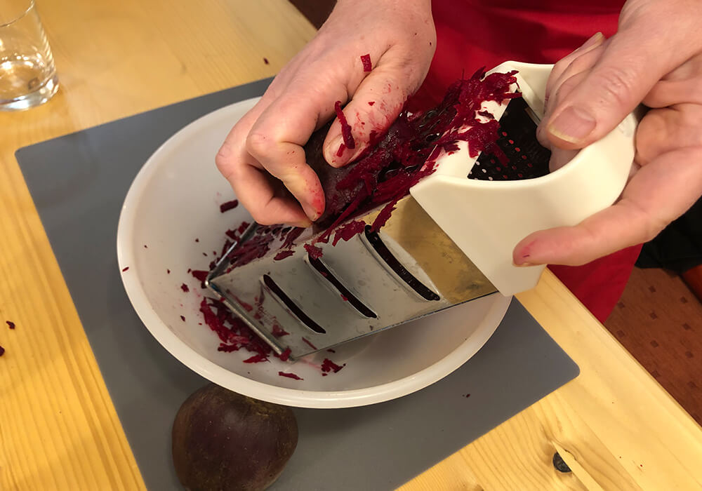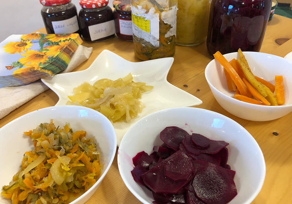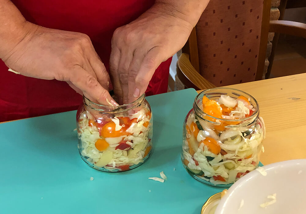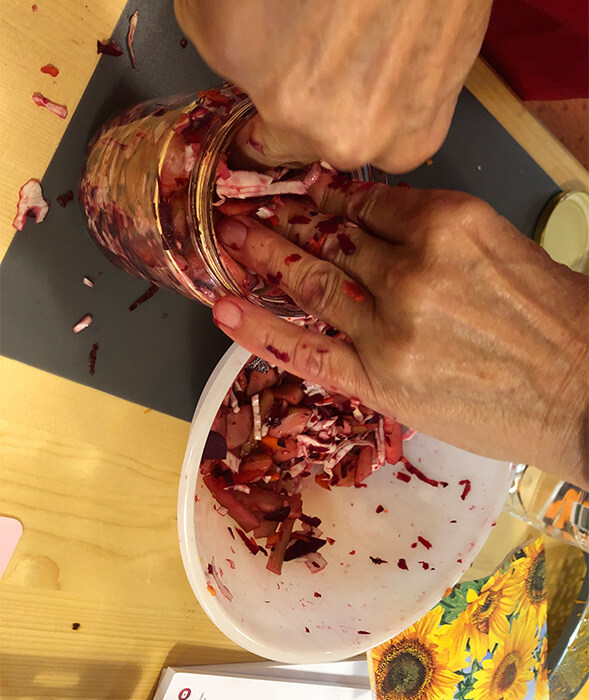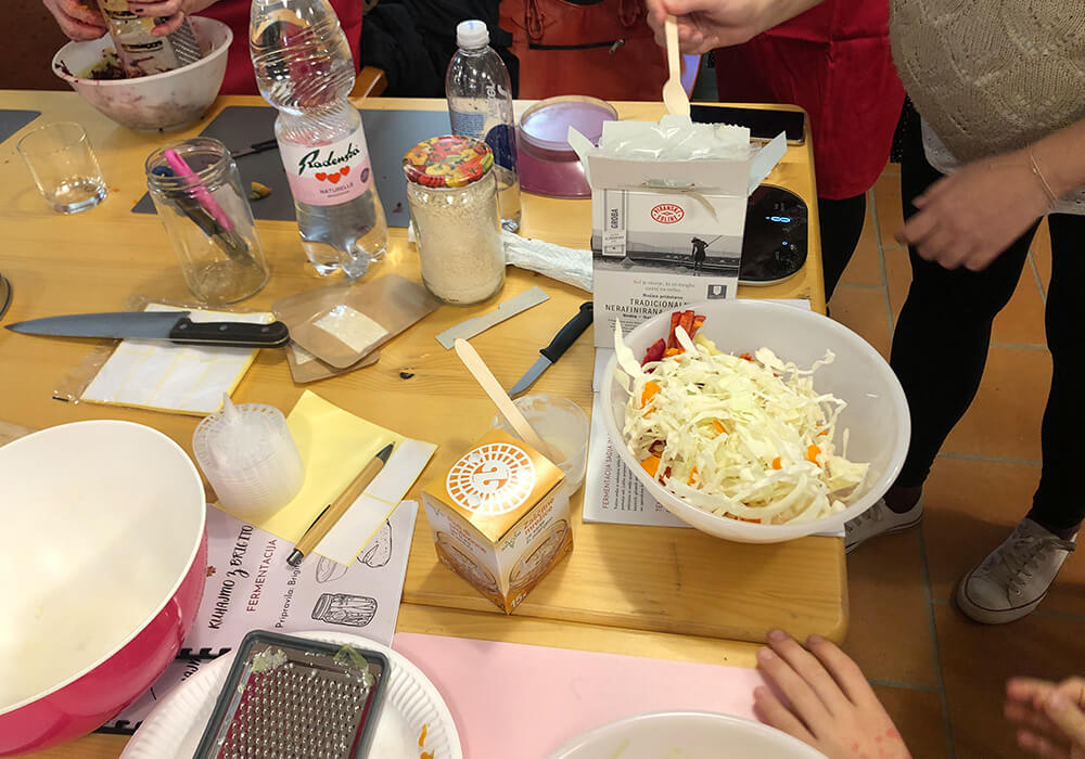 Drugi del delavnice je bil praktično naravnan. Udeleženke so se lotile fermentacije zelenjave, podobno kot so to v preteklosti počele naše babice. Zelenjavo so narezale, naribale in napolnile kozarce za fermentacijo. Ta korak je bil pomemben za pridobivanje praktičnega znanja, saj je domača priprava fermentirane hrane pogosto preprostejša, kot se zdi na prvi pogled.