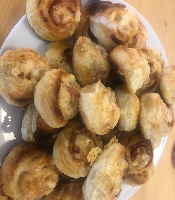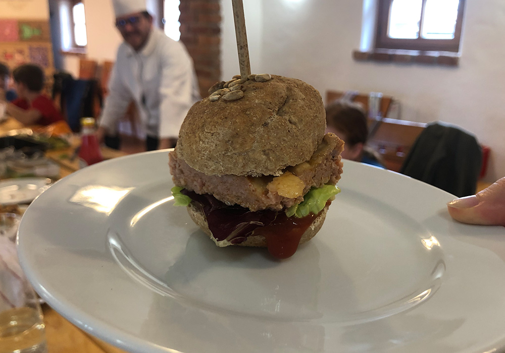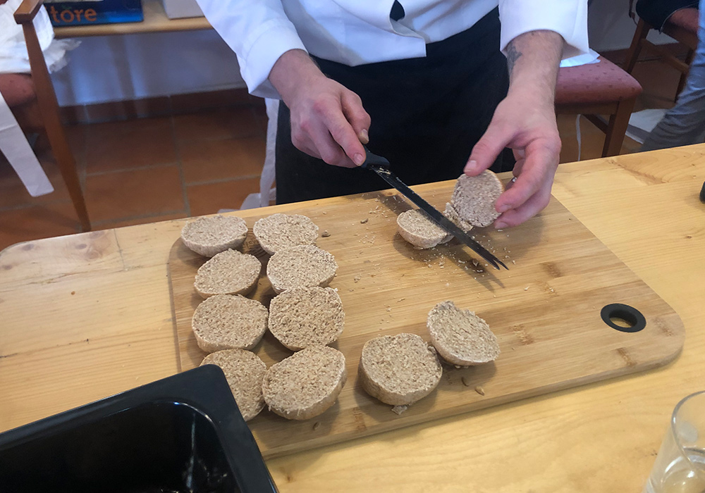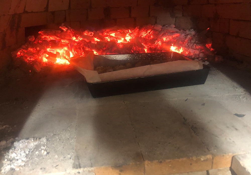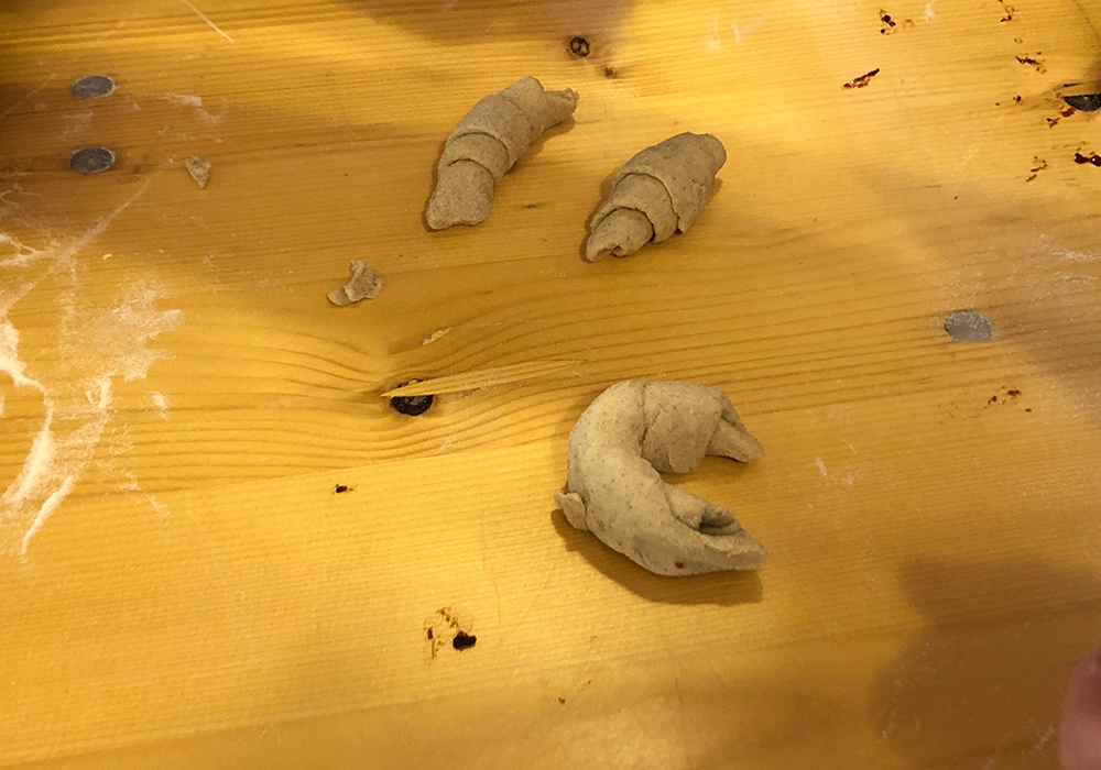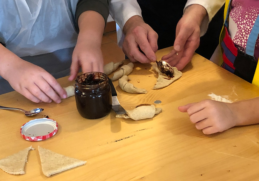 Delavnico smo začeli z oblikovanjem rogljičkov iz že vzhajanega testa, ki so jih otroci napolnili z domačo slivovo marmelado. Nato so se naučili pripraviti testo za bombetke, ki so ga pustili vzhajati, vmes pa so ustvarili mini picete na zelo preprost način. Vse aktivnosti so potekale v kuhinji vzorčne kmetije, kjer imamo krušno peč, katero smo s pridom izkoristili – vse pripravljene dobrote smo spekli prav v tej peči, vključno s pleskavico, ki je v krušni peči dobila poseben okus.