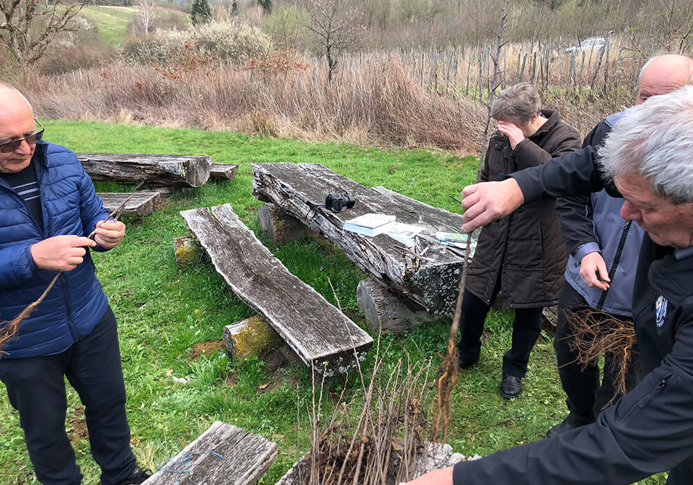 A gyakorlati foglalkozás után sétát tettünk a Tündérkertben, ahol több száz gyümölcsfa már rügyezésnek indult, jelezve a tavasz közeledtét. Kovács Gyula bemutatta a kertben található ritka és őshonos gyümölcsfajtákat, hangsúlyozva a biodiverzitás megőrzésének fontosságát.